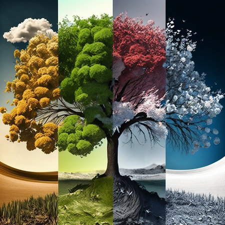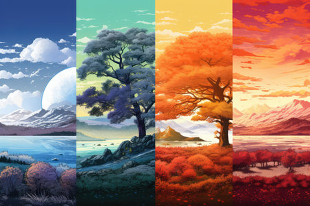 A captivating illustration showcasing the four seasons, featuring a snowy winter scene, a blooming spring landscape, a sunny summer view, and a colorful autumn display in nature.