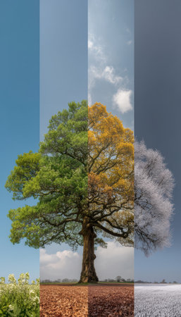 A striking composite photograph depicting a single tree across the four seasons: vibrant spring, lush summer, colorful autumn, and frosty winter. each quadrant unique beauty and transformation as the environment shifts through the year.