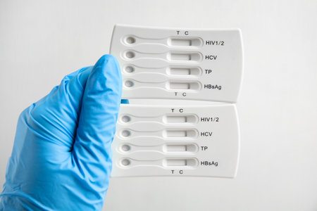 Close-up of a physicians hands holding the covid19 rapid test with a positive result and others in the background with a negative result to test the patients immunity