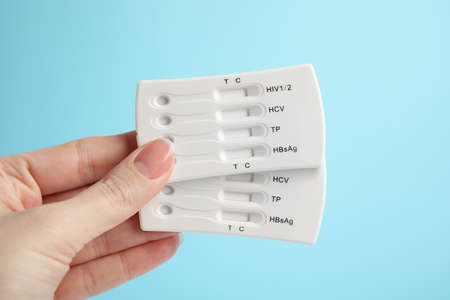 Woman holding two disposable express tests for hepatitis on light blue background, closeup