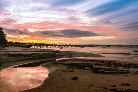 Sunset on the beach of Sanlucar de Barrameda with boats in its waters, Cadiz, Andalusia, Spain