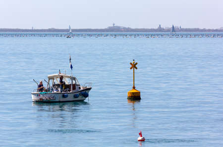 DUINO AURISINA, Italy - March 30, 2019: Boat next to a yellow buoy in the Sistiana bay near Trieste, Italy, with a man and a young woman