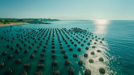 Rows of Shellfish Cultivation Structures Stretch Across Calm Waters at Sunset Near Coastal Community. Generative AI