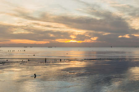 Evening sunset on the beautiful landscape with some seagulls flying in the sky at Bangpu, Thailand.