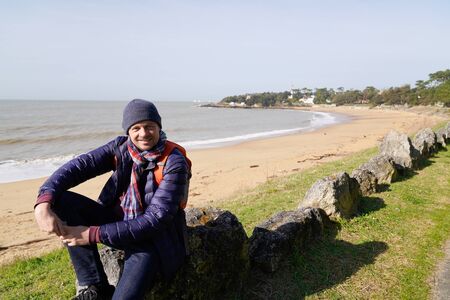 handsome man on sea beach on winter vacation