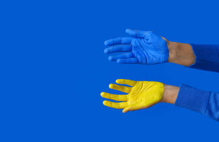 Hands with painted palms in colors of Ukrainian flag on blue background