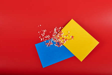 Abstract background from colored paper of red, yellow and green colors. Minimal geometric shapes and lines in pastel colors. Colored pastel paper texture minimalism. Cardboard backgrounds.