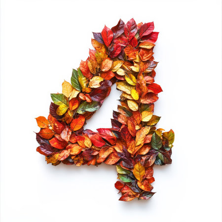 Number 4 made of fall leaves, flowers. berries. Vibrant autumn colors. White clean background. Generative AI.