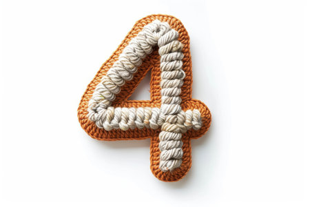 A close-up shot of a crocheted number four, crafted with orange and cream yarn. The image features a single, isolated number against a white background. The intricate design of the crocheted yarn creates a textured and visually appealing image.