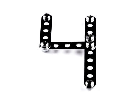 Math playing: Figure 4 is built with a children's designer, with the effect of black shiny steel, a slight slope. Isolated on white with shadows, front view