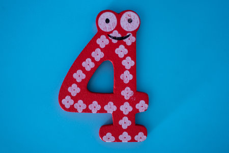 Red number four with eyes on blue background. Isolated blue background.