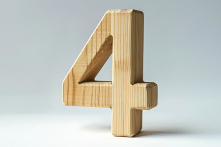 Cute wooden number 4 or four as wooden shape, white background, 3D illusion, storybook style.