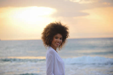 beautiful woman portrait with afro hair relax at sunset on the sea