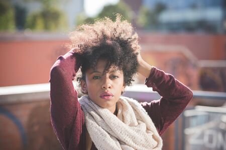 beautiful black curly hair african woman in town