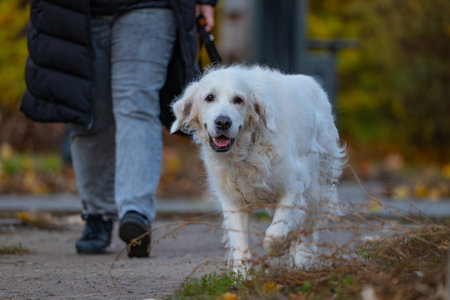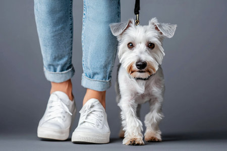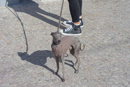 Portrait of lovely street dog stands nearby his owner, over street background. Woman lags in sport shoes and skirt