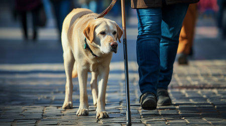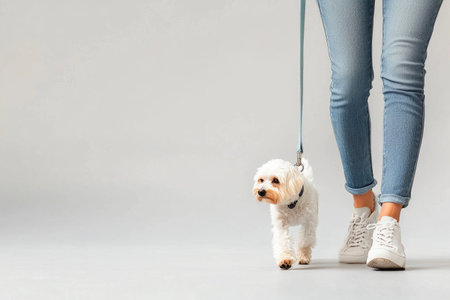 Dog with owner walking nicely on leash at sidewalk of urban street in rainy weather. Generative AI.