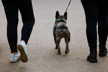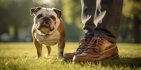 METRO MANILA / PHILIPPINES - JANUARY 27, 2018: An adult male bulldog jogging in the park with his human