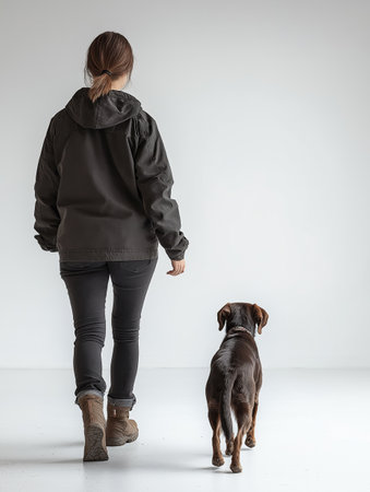 A young woman walks along the sidewalk with a smile, looking with her dog along the sidewalk.