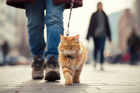 Walking a pet cat in city park on sunny autumn day. Cat on a leash in public place. Generative AI.
