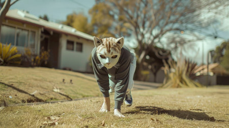 Teenage girl wearing costume of cat plays on grass, therian child in mask walks like animal in summer. Concept of furry, fitness, fandom, party, nature, subculture, character. Generative AI