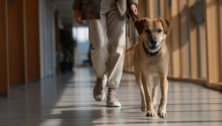A person is walking a dog in a hallway. The dog is wearing a collar and he is well-behaved. The hallway is well-lit, and the dog seems to be enjoying the walk