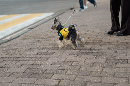 Dog on a leash on a zebra crossing in Amsterdam, The Netherlands