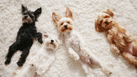 Four adorable dogs are lying peacefully on a soft white fur blanket, showcasing their relaxed demeanor in a cozy home atmosphere.