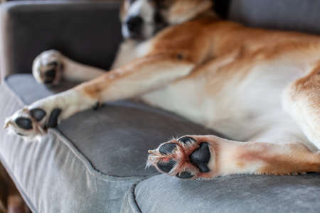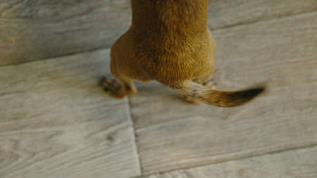 Macro photo paws with long claws of a small dog on a brown wooden background. Dog hair close-up.