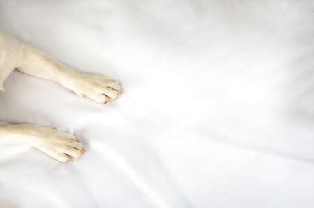 a close-up of a dog's fore legs placed on the floor of an indoor room