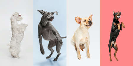 Jumping, motion. Stylish adorable dogs posing. Cute doggies or pets happy. The different purebred puppies. Creative collage isolated on multicolored studio background. Front view. Different breeds.