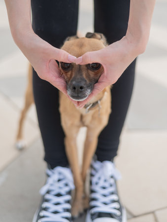 Portrait of lovely street dog stands nearby his owner, over street background. Woman lags in sport shoes and skirt