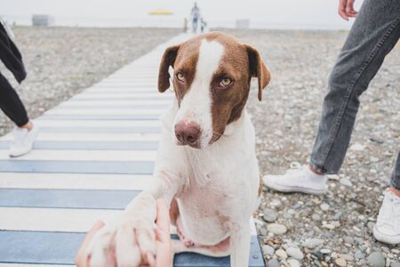 Cute trained homeless dog shaking paw. Point of view shot of a trained stray dog giving paw , adoption concept