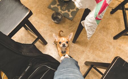 The pet lays its paws on the chair for the mistress. Toy terrier looks with yes. Top view, indoor. Dog ask begging for food, looking at the camera.