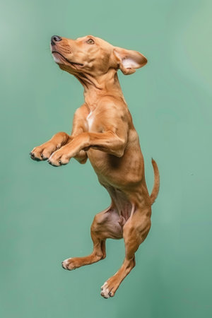 A playful dog energetically stands on its hind legs against a vibrant green background, showcasing its joyful spirit.