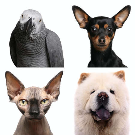 Portrait of five cute funny pets, closeup, isolated on a white background