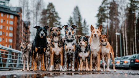 A group of dogs of various breeds and sizes are lined up and looking forward, with a backdrop of trees and buildings.