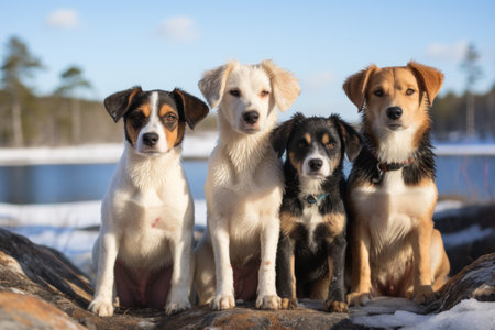 This captivating image showcases five joyful dogs gazing up at the sun against a clear blue sky. Their playful expressions radiate happiness and camaraderie, making it a perfect representation of the bond between pets and their environment.