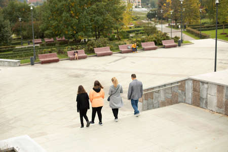 People walk in the park. The townspeople go down the stairs. Summer day in the city. People from the back.