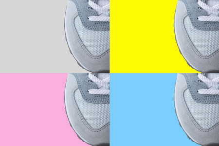 Gray sports sneaker shoe made of suede and mesh isolated on color backgrounds with copy space. Top view, flat lay. Blank for banner, advertisement, flyer, booklet with easily recolourable background