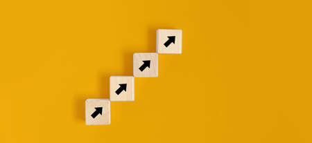 Business growth and success process concept. White dice blocks with arrow icons stacking as step stairs with icon business strategy and an action plan on a wood background.