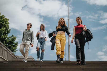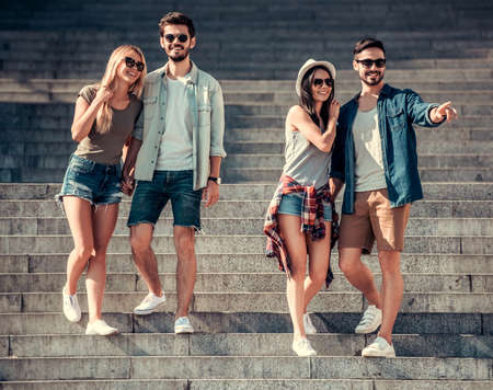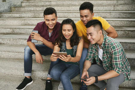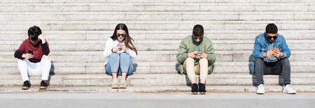Four young people sitting on stairs outdoors with mobile phones in their hands. Two women and two men in casual style holding smartphones, smiling and looking at camera
