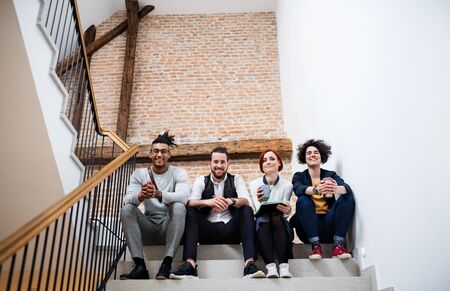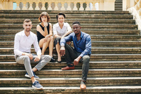 Group of young businesspeople sitting on stairs indoors, looking at camera.