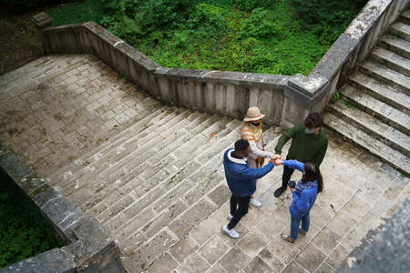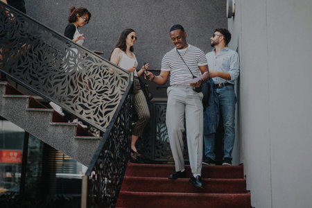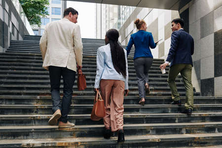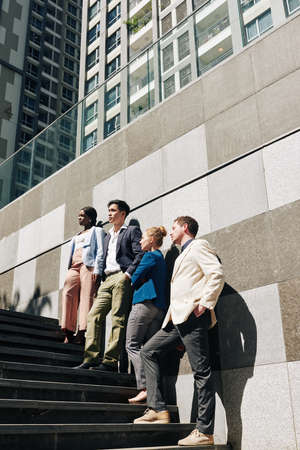 Members of multi-ethnic business team standing on steps, career and ambitions concept