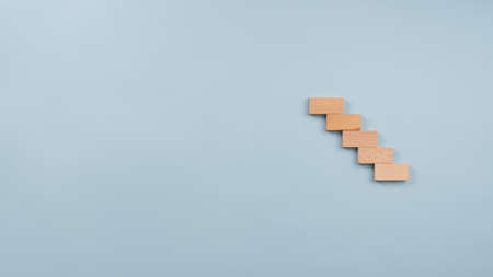 Wooden block stacking as step stair on blue background, Ladder of success in business growth concept.