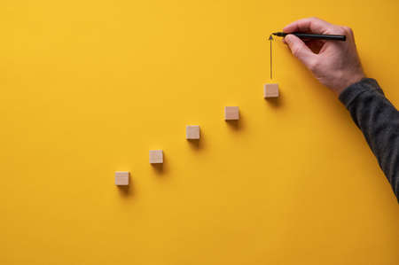 Male hand drawing an upward pointing arrow on top of a growing graph made of wooden blocks. Over yellow background.