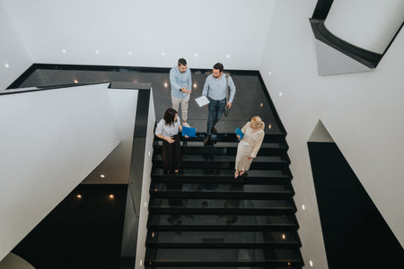 Four people stand on a modern glass staircase, discussing plans during a business meeting