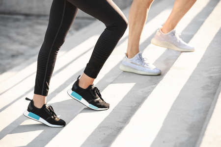 Closeup woman's feet in white sneakers walking up on the stair outside the building, step by step level concept