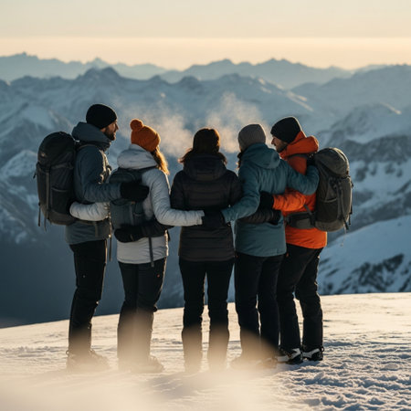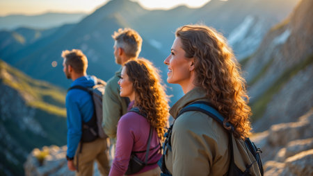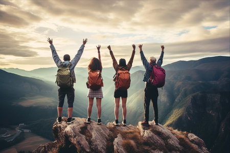 A group of diverse individuals stands triumphantly on the summit of a majestic mountain, taking in the expansive view.