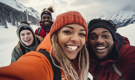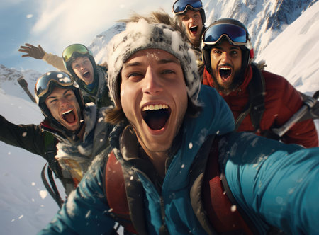 Friends gather in the snow, smiling and laughing while posing for a selfie. The bright sun shines over the scenic mountain landscape, creating a joyful atmosphere during ski trip. Generative AI.
