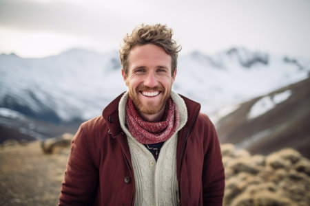 A man with a beard and a blue shirt is smiling at the camera. The mountains in the background create a serene and peaceful atmosphere